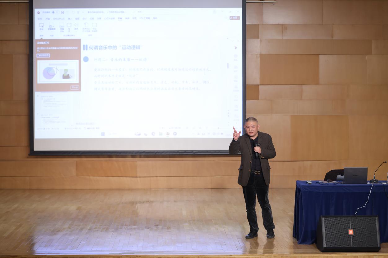 在构建理论框架的基础上,向民教授并未止步于抽象论述,而是通过对三首风格迥异的经典作品——贝多芬《第一钢琴奏鸣曲》、《第二十三钢琴奏鸣曲“热情”》、秦文琛《Pipa Words》进行深入剖析,生动地演示了如何在实际分析中捕捉并诠释“运动逻辑”。在分析贝多芬的作品时,他揭示了古典范式下,动机如何通过严谨的逻辑驱动音乐向前发展,构建出宏大的叙事张力;在解读当代作曲家秦文琛的《Pipa Words》时,则展示了如何分析非传统调性音乐中,音色、织体与空间感的运动逻辑,从而理解其独特的音乐语言与意境营造。