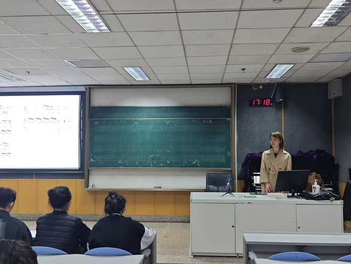 公开课环节,朱莎以“理论-实践-应用”为脉络,层层递进引导学生探索增三和弦的音响魅力。首先,她从理论根基入手,系统剖析增三和弦的构成原理,着重突出其“不协和性”与“强烈扩张感”的核心音响特质;进入实践阶段后,课程分为“听辨”与“听写”两大模块——通过大量钢琴弹奏实例,训练学生对和弦色彩与张力的敏锐捕捉能力,再以听写练习巩固理论认知,强化内心听觉与记谱技能;课程收尾时,朱莎引入经典音乐作品片段,带领学生在真实音乐语境中辨析增三和弦的实际运用,将孤立的和弦知识与鲜活的音乐表达相连,让学生直观感受其在“塑造情绪、营造奇幻色彩、推动音乐发展”中的独特价值,真正实现从“认知”到“应用”的跨越。