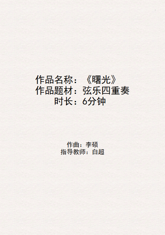 弦乐四重奏《曙光》是看见日出所得出的灵感写出的旋律,形容日升日落的画面。整首作品使用大调音乐使得作品明亮,表达了光明,诙谐的情绪。作品动机更偏向五声调式 ,其中运用了弦乐大量的拨奏,连弓等弓法。这个作品是带再现的复三式曲式结构。在创作过程中要打破传统的和声安排,并合理安排四个声部的层次,节奏型的穿插打破小节。同时在再现部抛弃原本的传统的完全再现,将再现部改成变化再现。俄罗斯“作曲家”国际作曲比赛评审团的专家们对这首作品也表示认可。