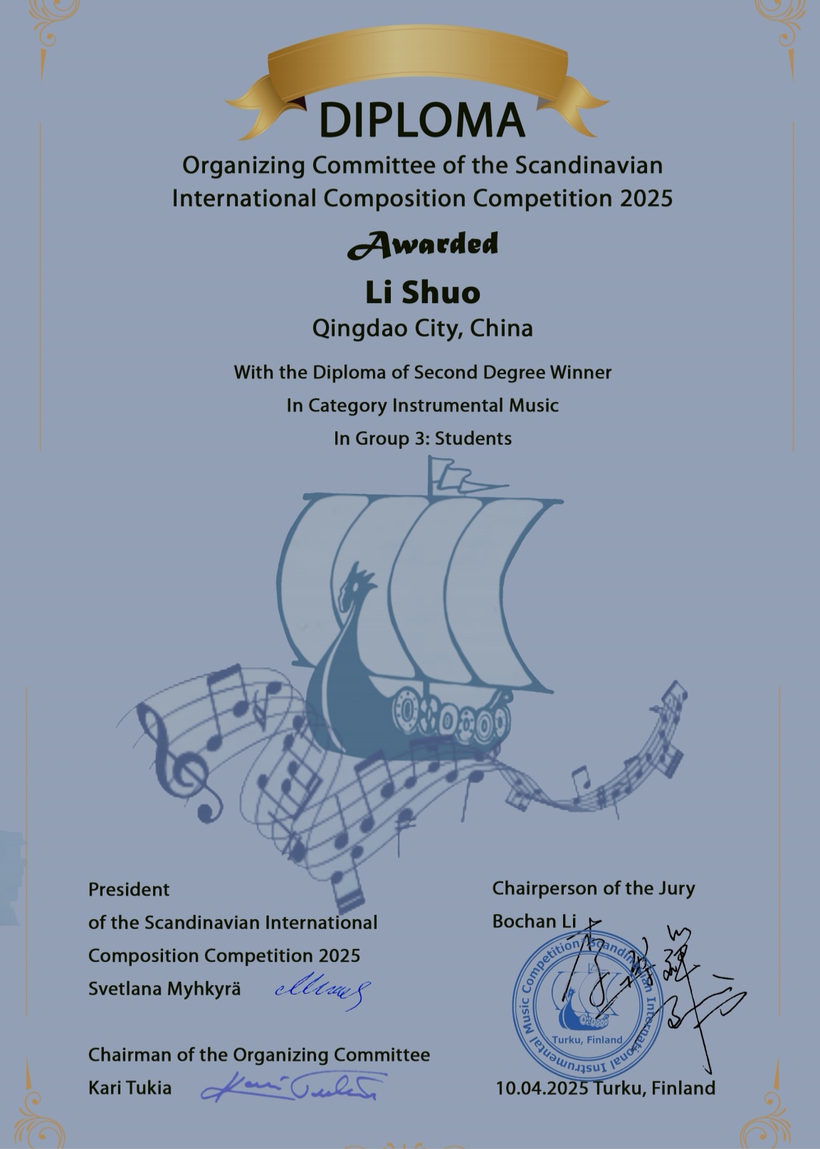 2025年4月14日,2020级作曲系本科生李硕创作的弦乐四重奏作品《C大调奏鸣曲》在2025年芬兰国际斯堪的纳维亚作曲比赛中荣获二等奖,指导教师白超副教授获得优秀指导教师奖。