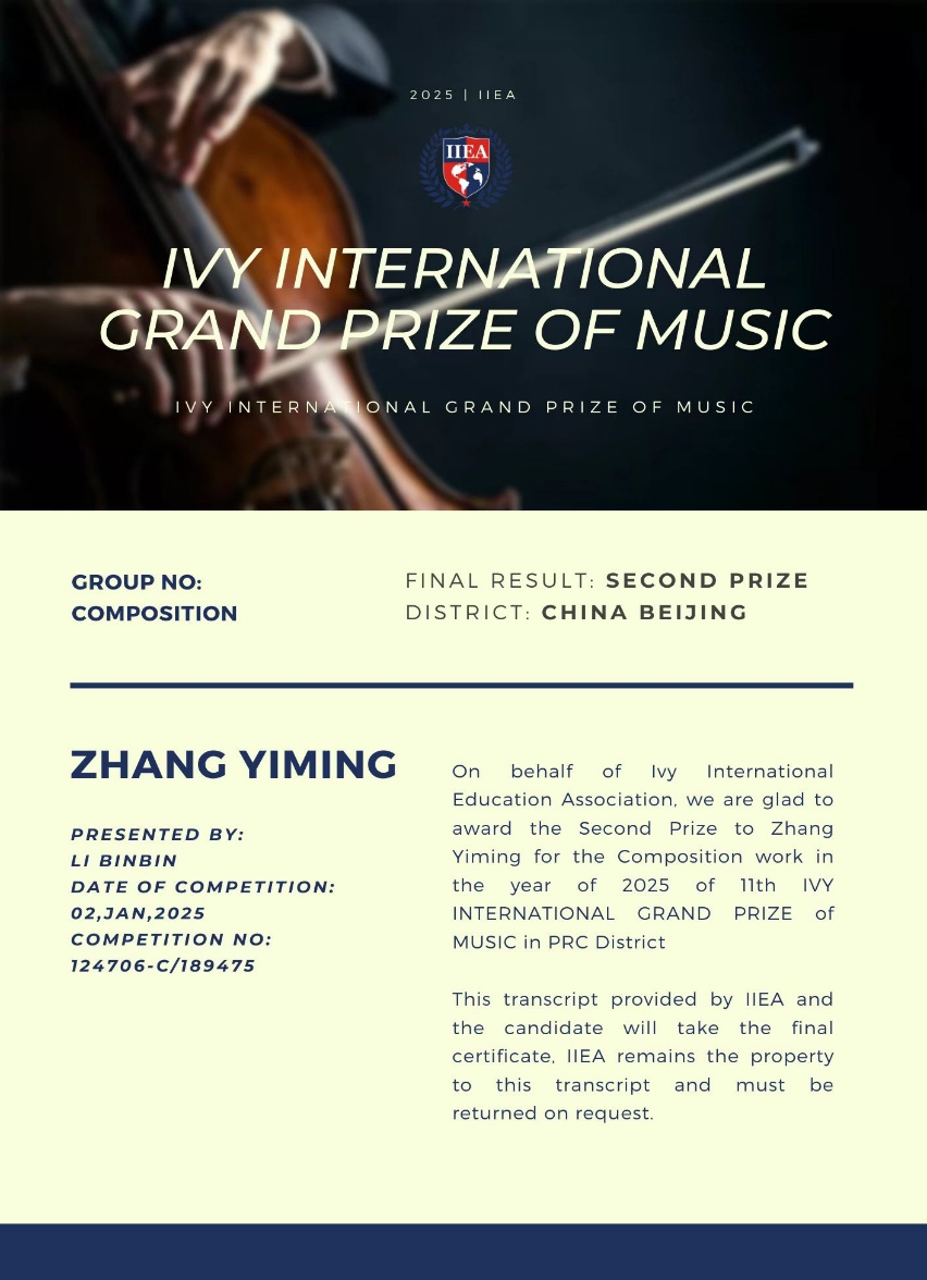 2023级作曲系本科生张益铭的钢琴独奏作品《齐鲁回响变奏曲》(作品指导老师:李彬彬)在2025年第十一届常青藤国际作曲大赛青年艺术家组(19-26岁)中荣获二等奖。