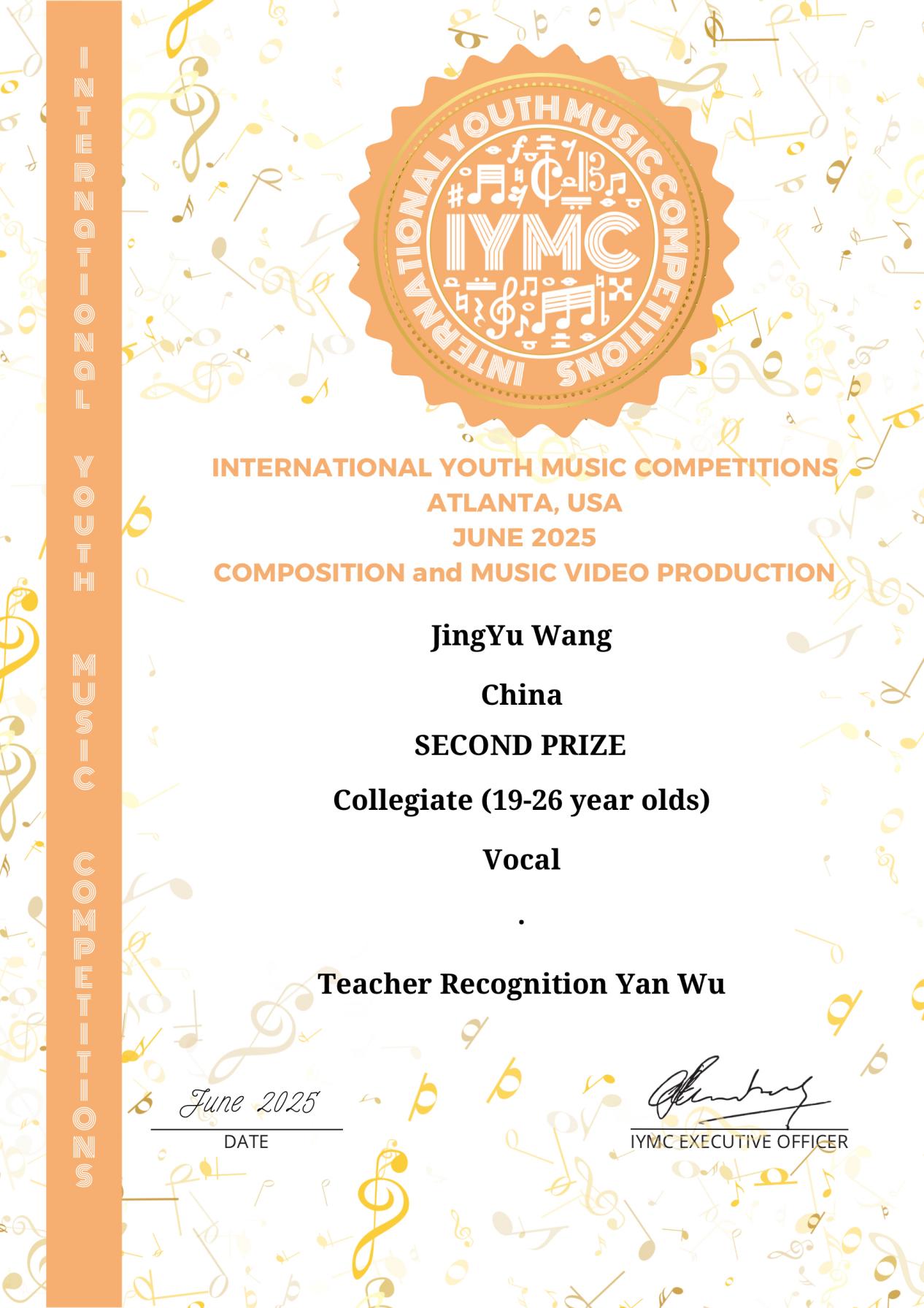 作曲系2024级本科生王靖喻创作的声乐作品《虞美人·听雨》,在2025年美国国际青少年音乐比赛——作曲组(大学生组)荣获二等奖,指导教师吴延获得优秀指导教师奖。