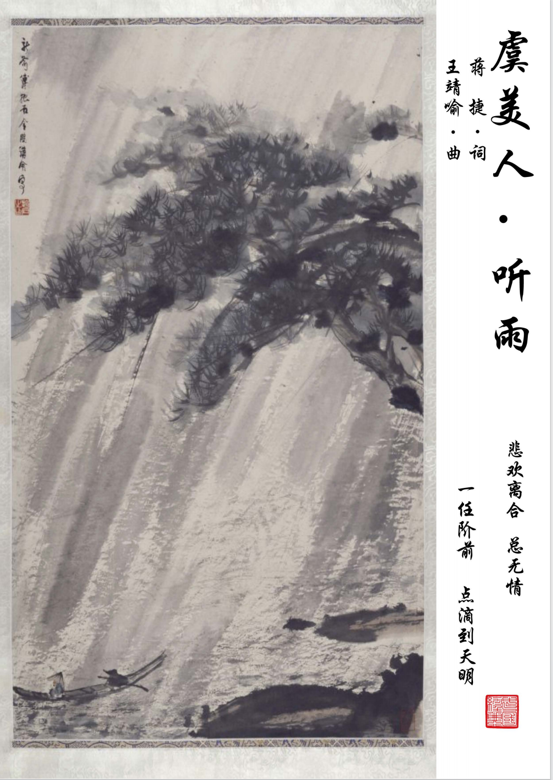 作品以南宋词人蒋捷的《虞美人·听雨》为文本内核,通过音乐重构词中「少年歌楼听雨」「壮年客舟听雨」「暮年僧庐听雨」的三重人生境遇。以「雨」为意象纽带,将词中时空交叠的沧桑感、生命流逝的哲思,转化为五声调式特有的线性韵律与留白美学,实现中国古典诗词「声情相洽」的艺术追求。