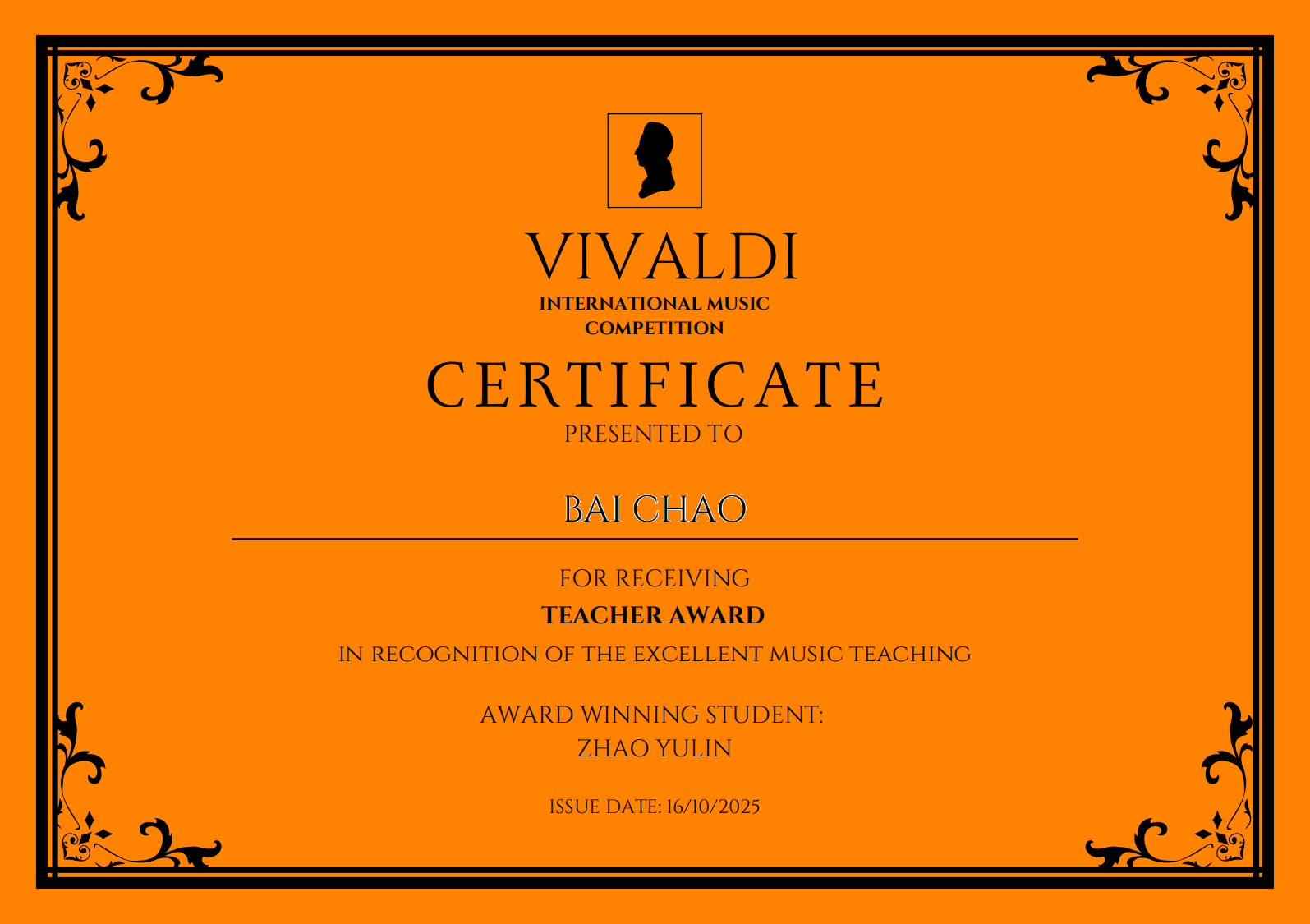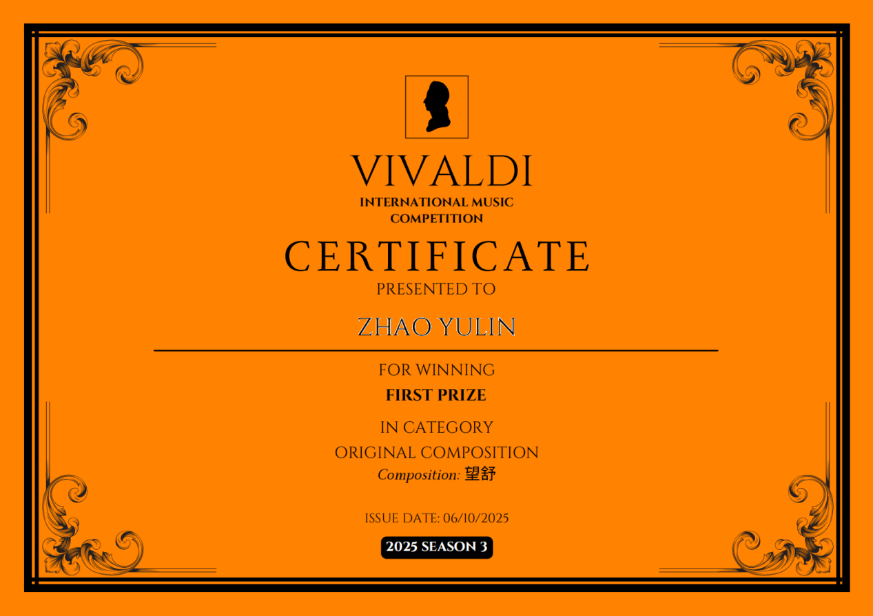 作曲系2023级作曲专业研究生赵昱霖在2025年维瓦尔第国际音乐比赛中获得佳绩:管弦乐队作品《望舒》荣获作曲组一等奖。指导教师白超副教授获评优秀指导教师奖。