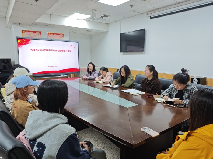 为保障2026年春季运动会志愿服务工作有序开展,4月21日下午,作曲系在系会议室召开2026年春季运动会志愿者培训会议。全体运动会志愿者、班主任及辅导员参加会议,作曲系副主任、副书记雒鹏翔主持会议。